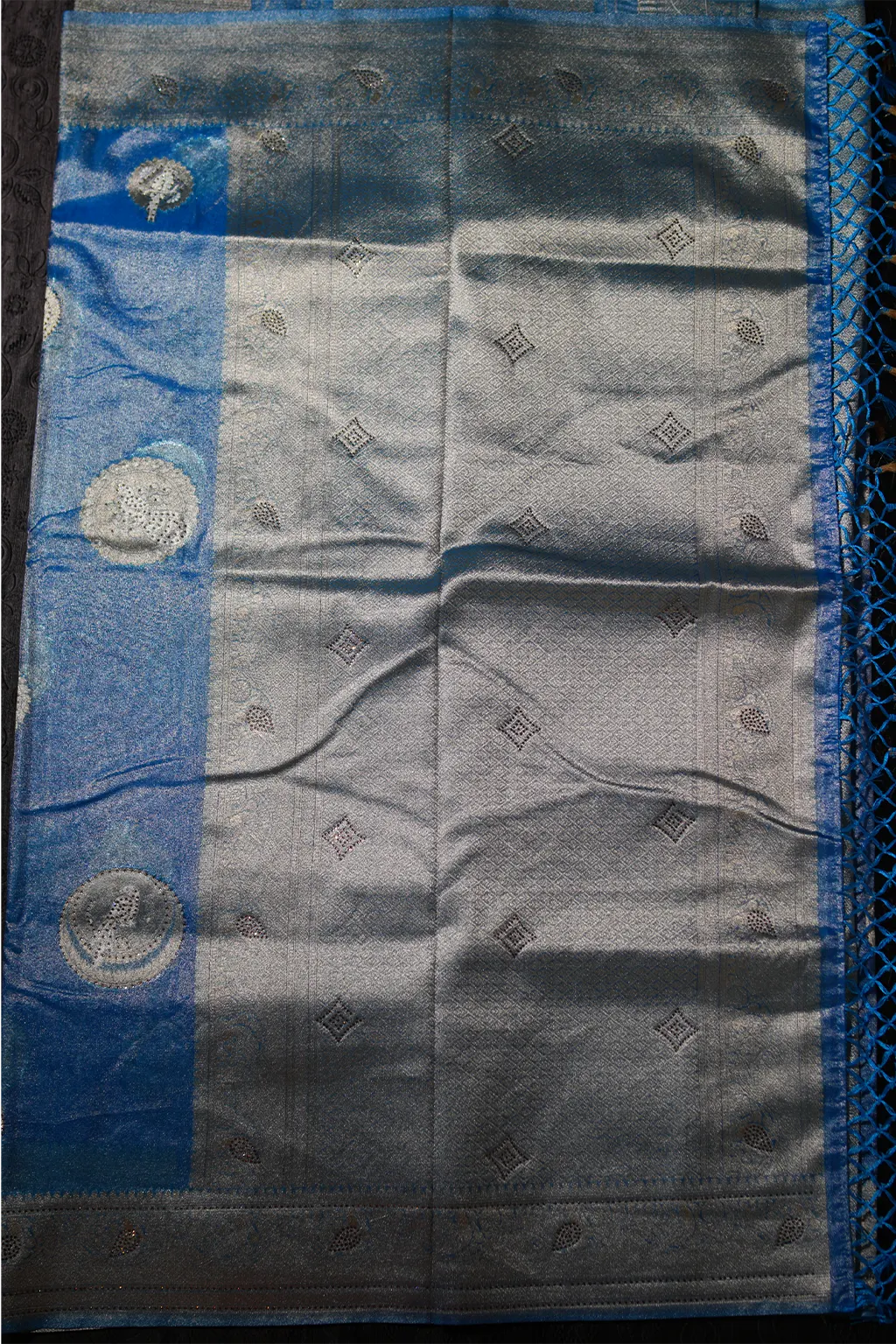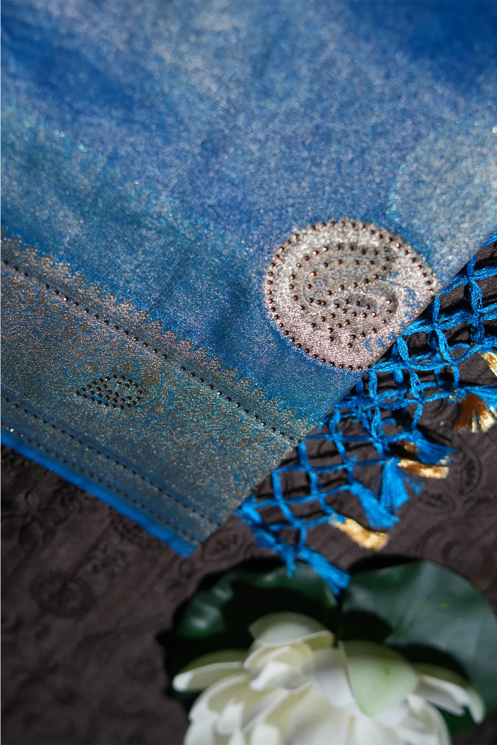 The Azure Grace Tissu Silk Fancy Saree  combines the luxurious sheen of silk with intricate golden embroidery, making it a perfect choice for grand celebrations. The beautiful blue fabric is enhanced with paisley motifs in gold that flow seamlessly throughout the saree, while the border adds an additional touch of elegance. The tasseled border further elevates the look, bringing a contemporary flair to this traditional design. This saree is ideal for weddings, receptions, or any special occasion where you wish to make a lasting impression. Its soft, fluid drape, combined with the rich colors and detailing, ensures you’ll feel both regal and graceful. Pair it with gold jewelry to highlight the richness of the saree.