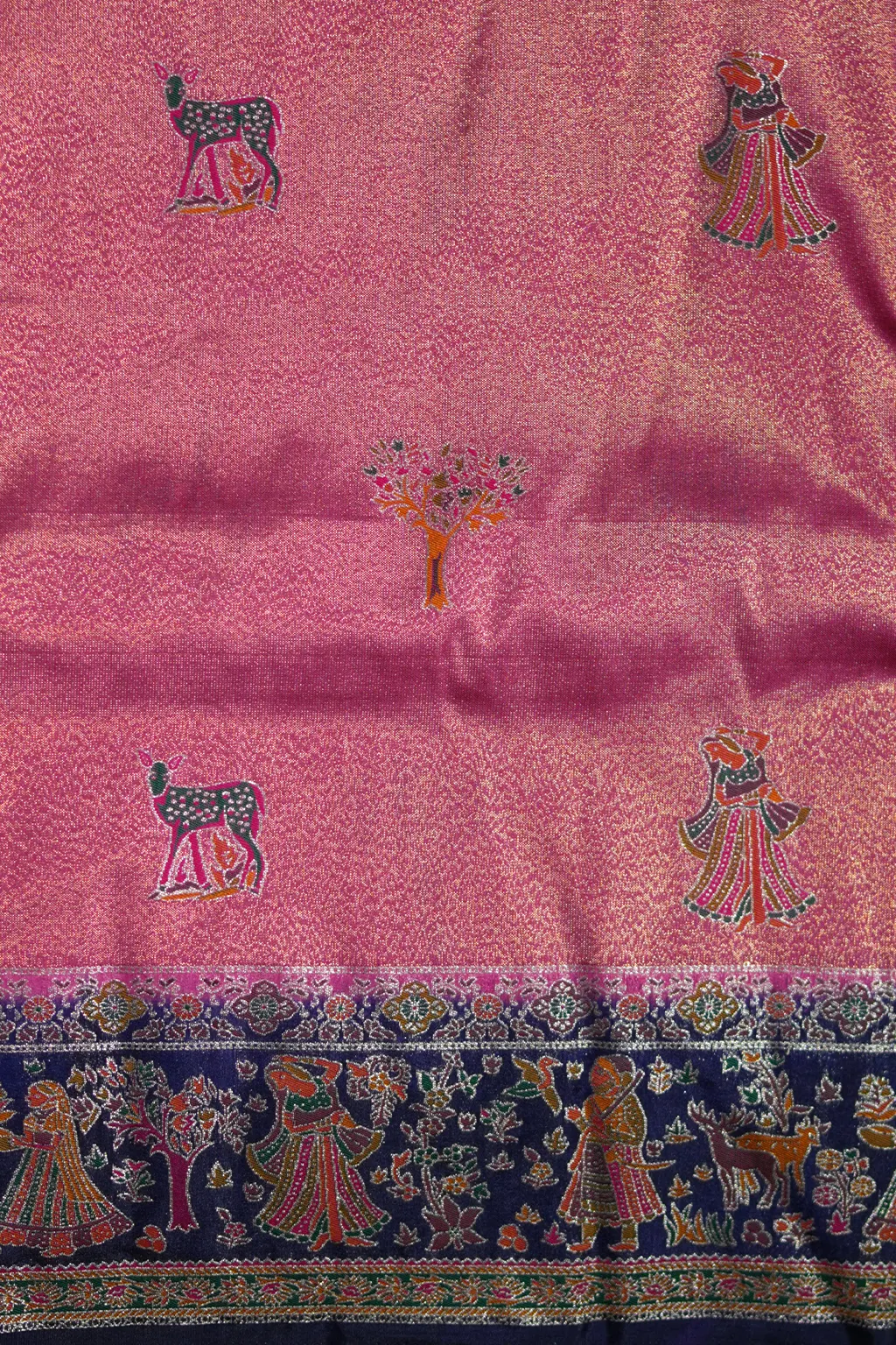 The Desert Blossom Tissu Silk Fancy Saree is a unique masterpiece that brings together soft peach tones with a beautifully embroidered border and hand-crafted motifs, including animal figures and nature-inspired designs. The delicate artwork is carefully stitched throughout the saree, creating a seamless fusion of culture and craftsmanship. The navy blue border adds a striking contrast, giving the saree an added depth and elegance. Perfect for cultural events, festivals, and semi-formal gatherings, this saree embodies grace, sophistication, and timeless beauty. The lightweight fabric and the intricate tassels at the bottom further enhance its allure, making it a go-to choice for those who want to stand out with an understated yet elegant look. Pair it with gold jewelry to complement the artistic charm of the saree.