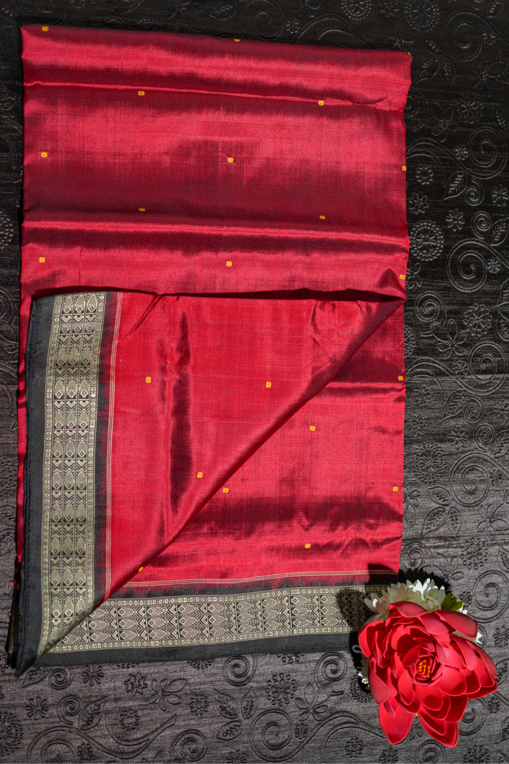Gulmohar Classic celebrates elegance in its purest form. With its deep maroon canvas and scattered golden accents, the saree radiates sophistication. The striking black-gold border, crafted with geometric and cultural patterns, adds depth and character. Its soft drape and luxurious finish make it ideal for festive gatherings, special events, and sophisticated styling.
