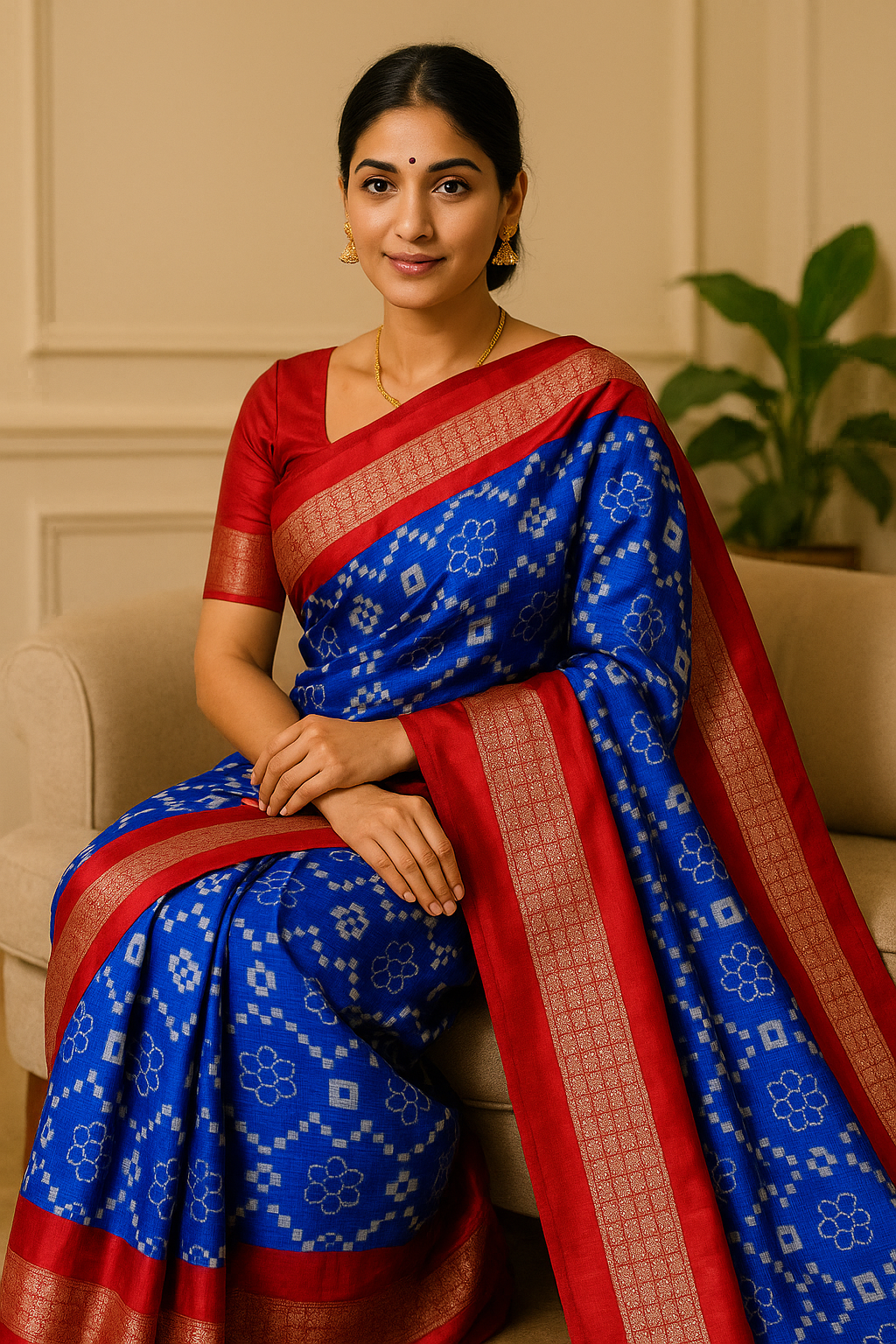 Classic blue Ikat patterns paired with a heritage maroon border—bold, beautiful, and regal.