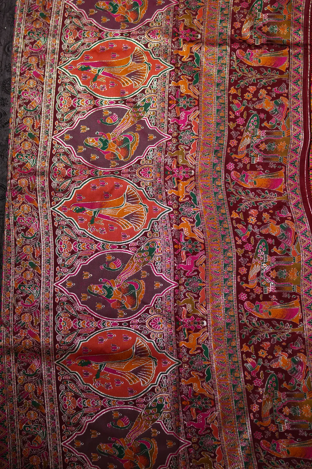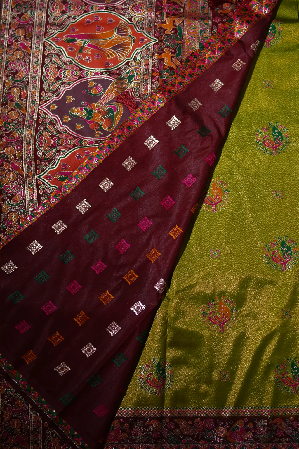 A blend of elegance and tradition, this green saree with intricate peacock motifs and a contrasting maroon border exudes grandeur, perfect for wedding celebrations and festive events.