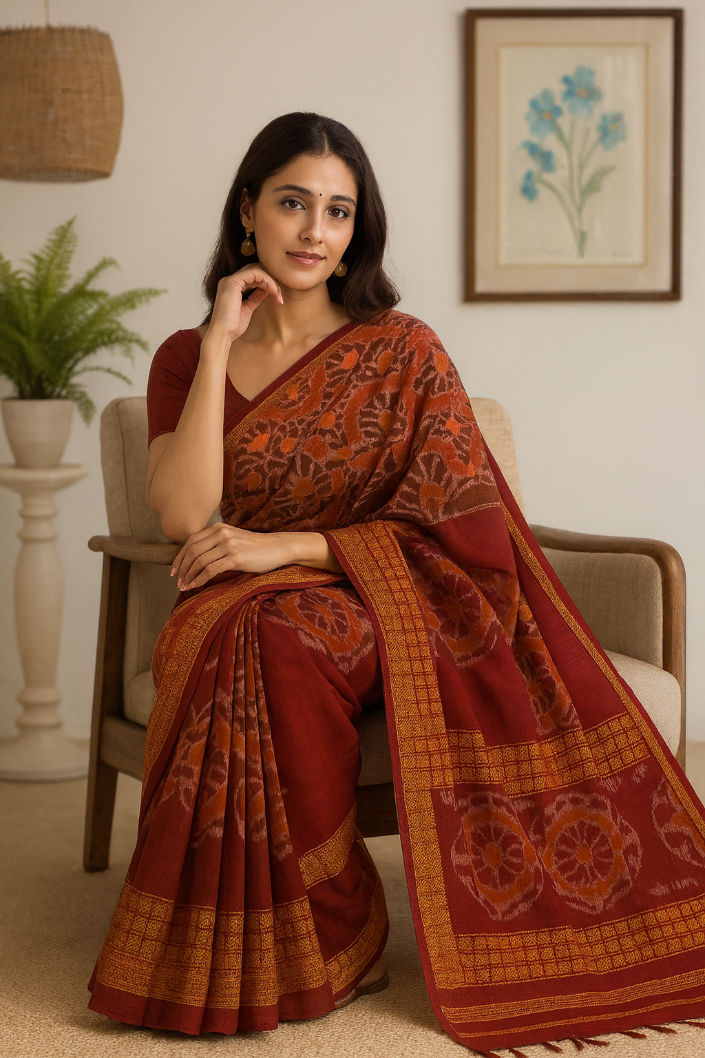 “Marigold Heritage Ikat” captures the essence of traditional artistry with its earthy rust palette and intricate woven patterns. The saree’s beautifully detailed marigold-gold border elevates its rich texture and gives it a festive aura. Ideal for cultural events, traditional functions, and special evenings, it combines elegance, comfort, and heritage weaving in one stunning drape.