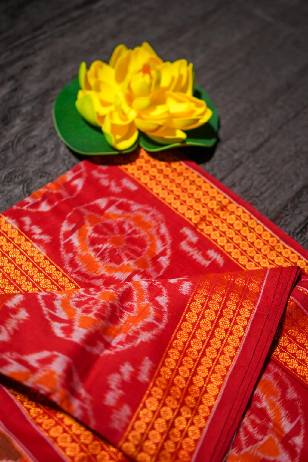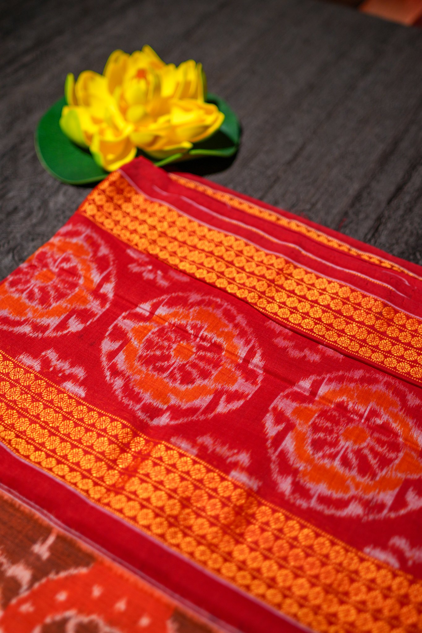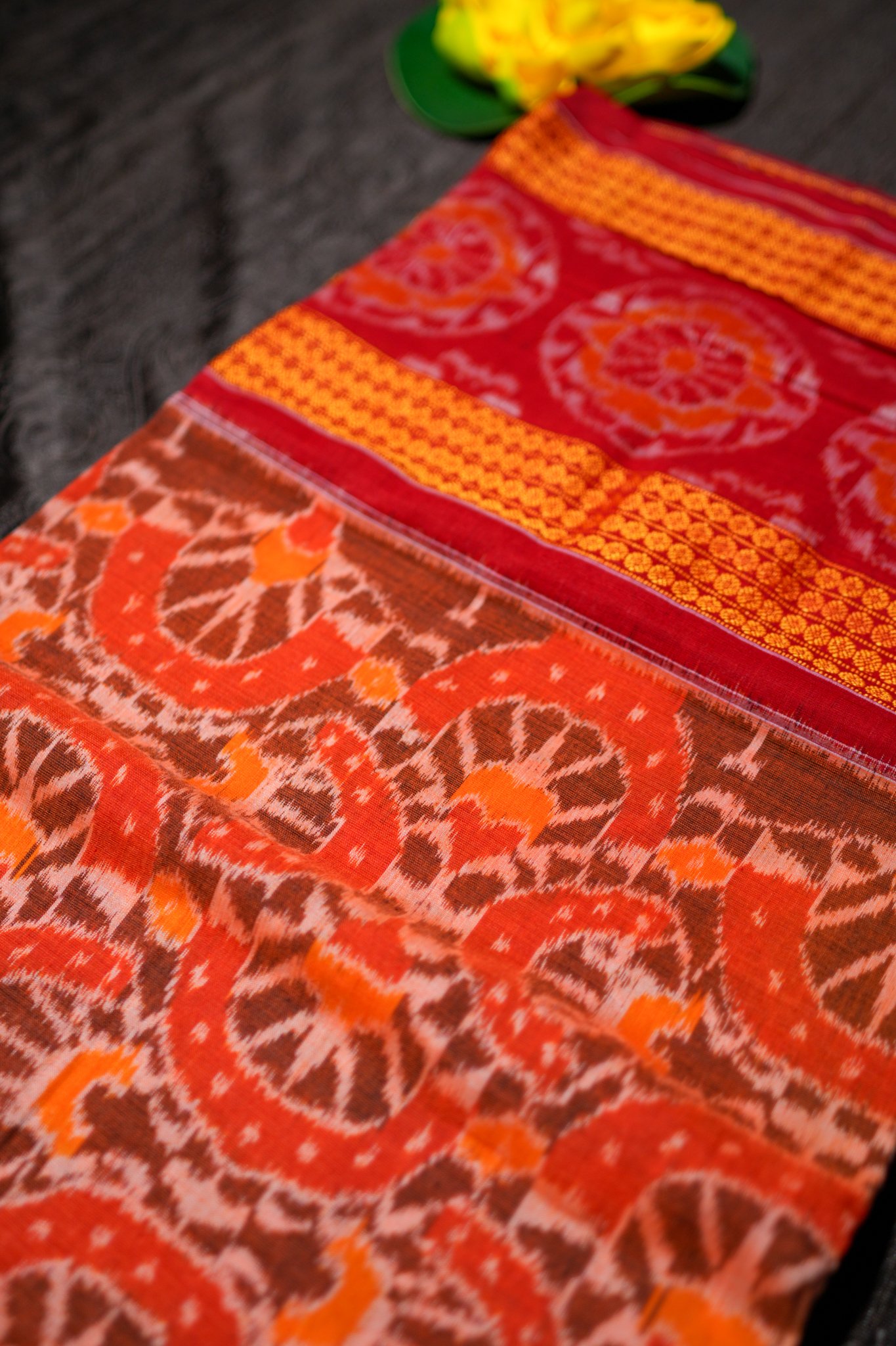 A warm-toned Ikat saree with vibrant marigold-gold borders for a graceful ethnic look.