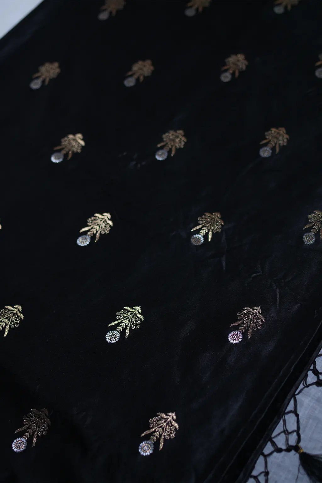 The Midnight Elegance Fancy Saree is a true representation of classic beauty with a modern twist. Made from rich black silk, it features delicate floral motifs embroidered in gold, enhancing its regal allure. The saree’s intricate border design and elegant drape make it an ideal choice for weddings, receptions, or festive events. The luxurious fabric and detailed embroidery bring out the beauty of traditional craftsmanship, while the black and gold color combination adds a touch of drama and glamour. Whether paired with statement jewelry or kept subtle with delicate pieces, this saree will leave a lasting impression at any special occasion.