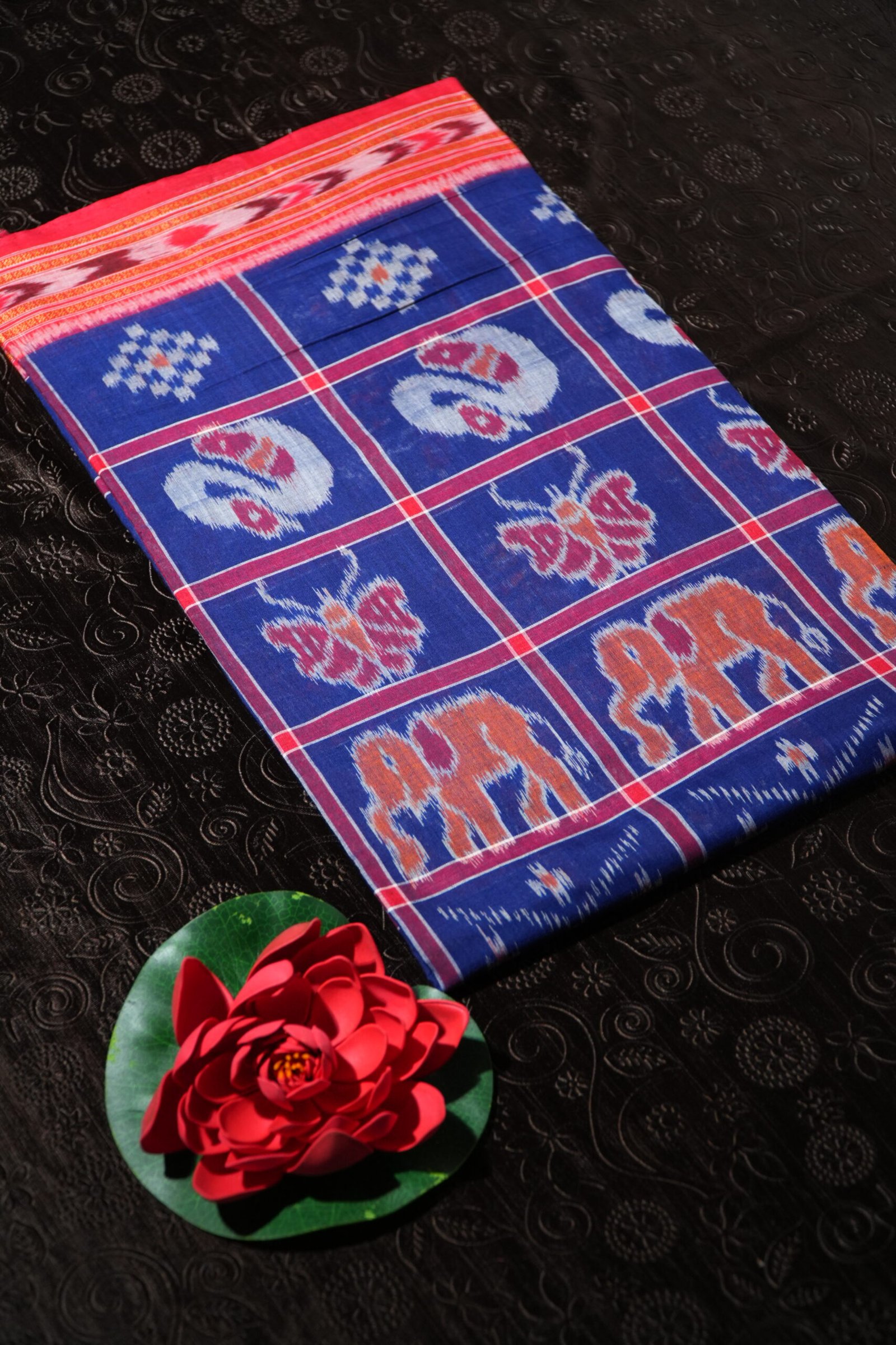 A graceful blue Ikat saree adorned with heritage elephant motifs and classic borders.