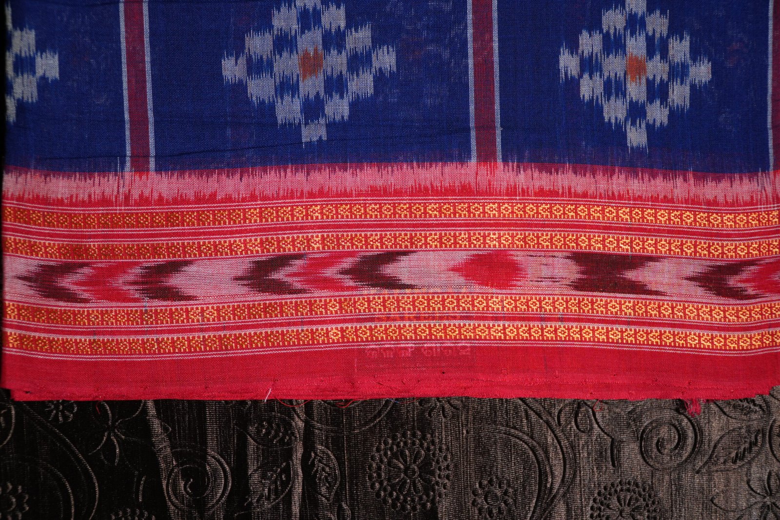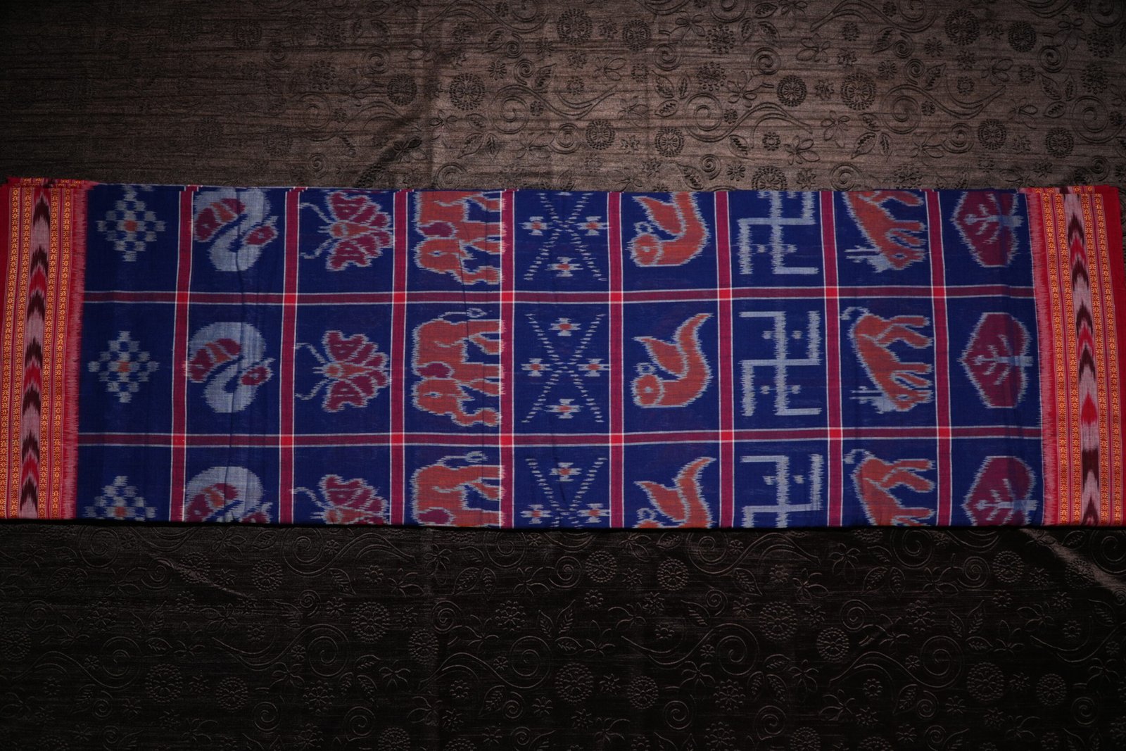 The Neel Gaj Ikat Saree is a celebration of timeless craftsmanship and cultural symbolism. Woven in a rich royal blue base, this saree features intricate Ikat patterns highlighted with traditional elephant motifs, symbolizing strength, wisdom, and prosperity. Accented with contrasting red and subtle white detailing, it is finished with a classic woven border that adds regal charm. Perfect for festive gatherings, cultural occasions, and elegant day wear, this saree blends tradition with understated sophistication.