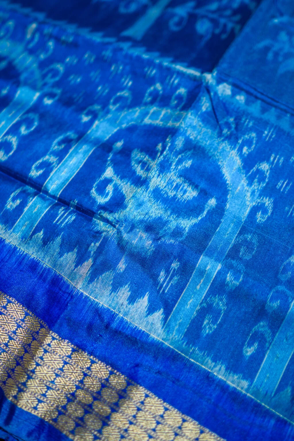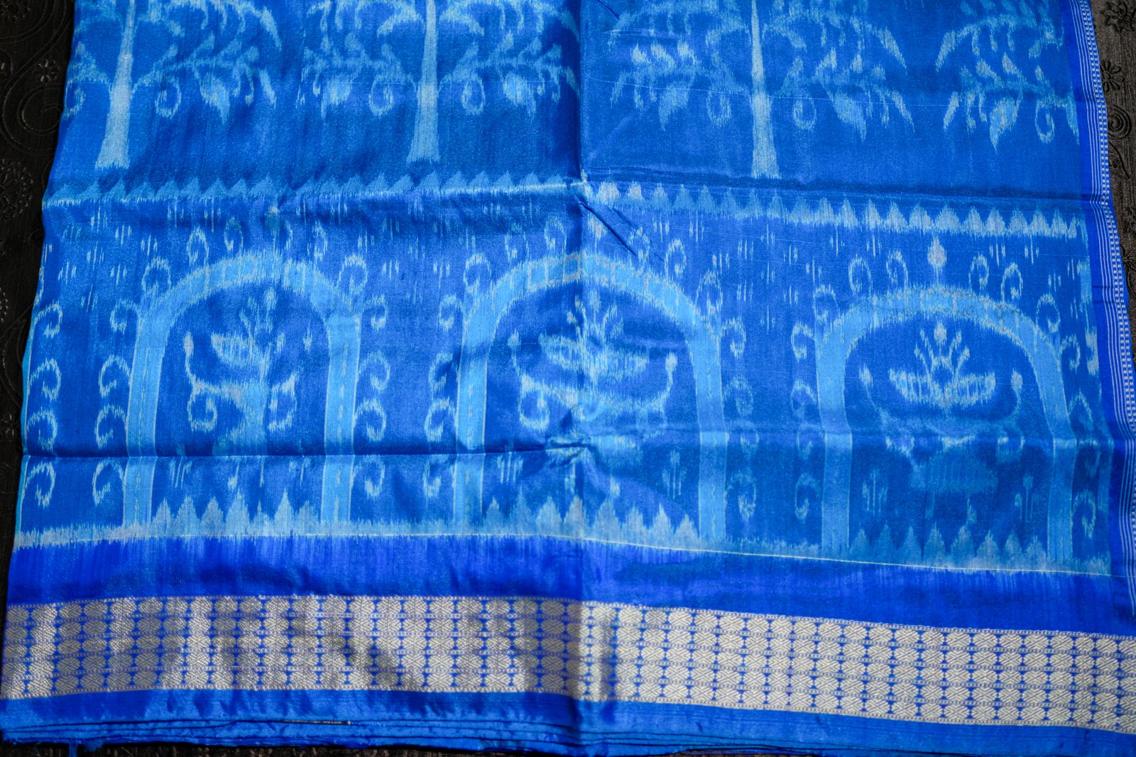 A serene blue Ikat saree enriched with elegant motifs and a shimmering silver border.
