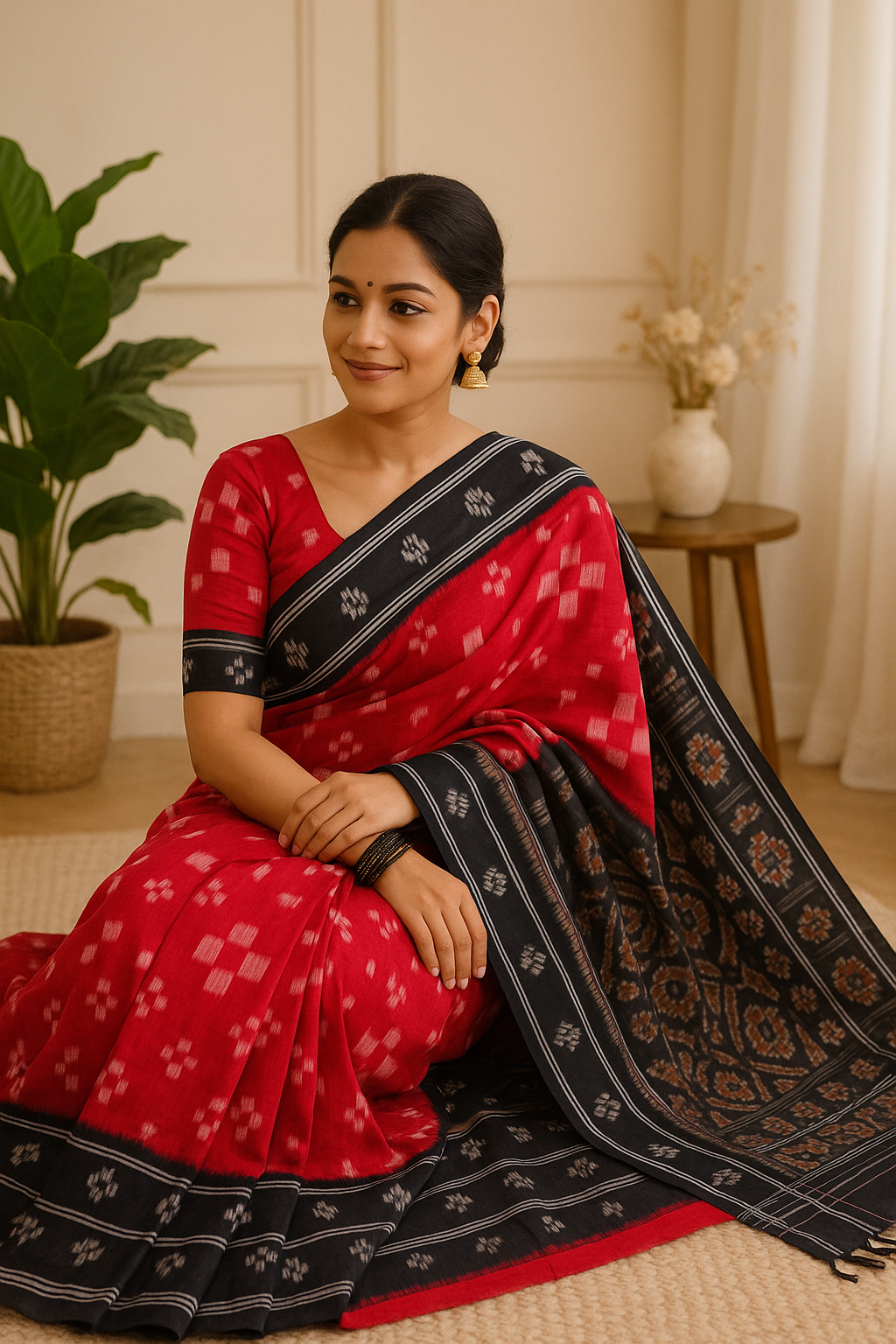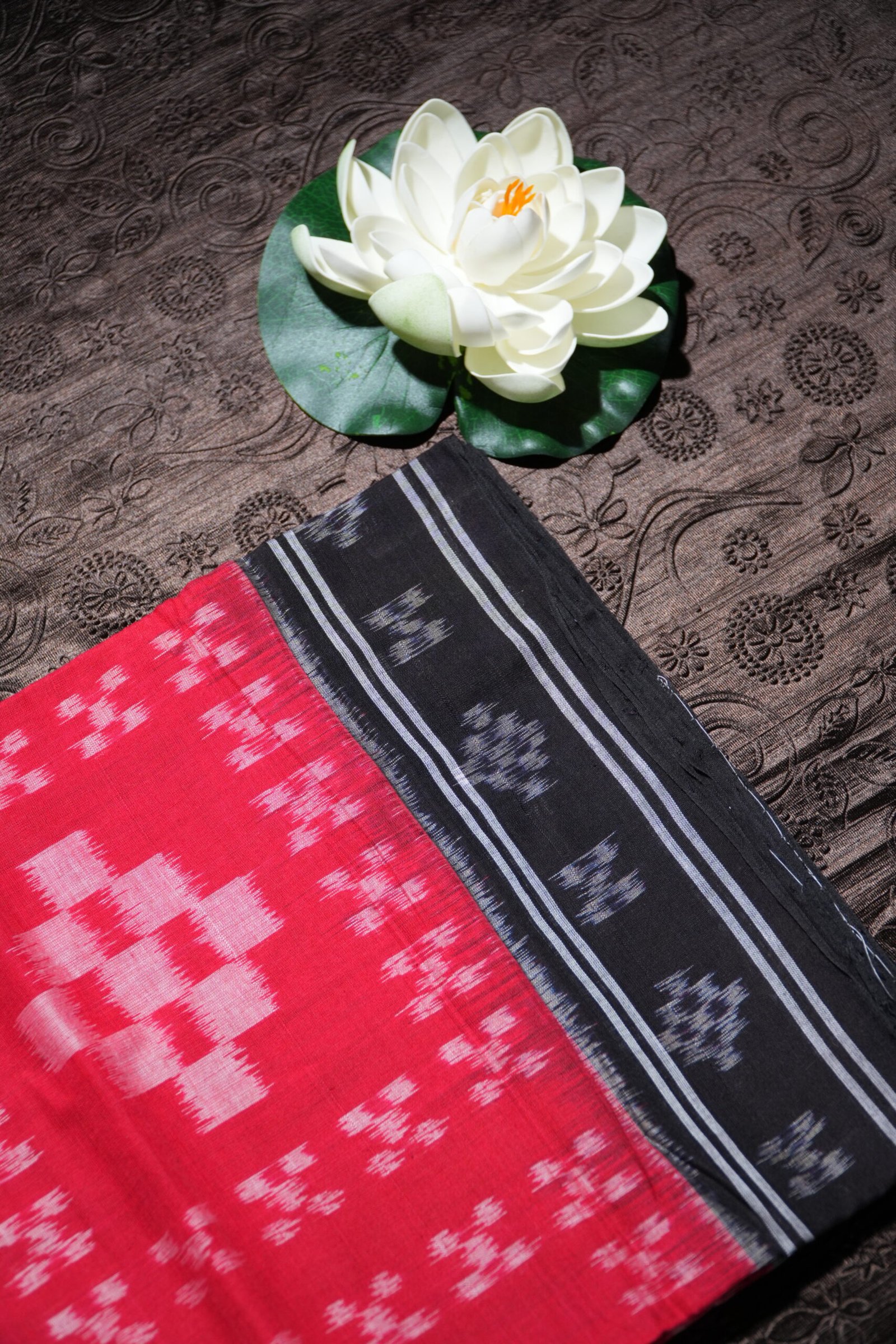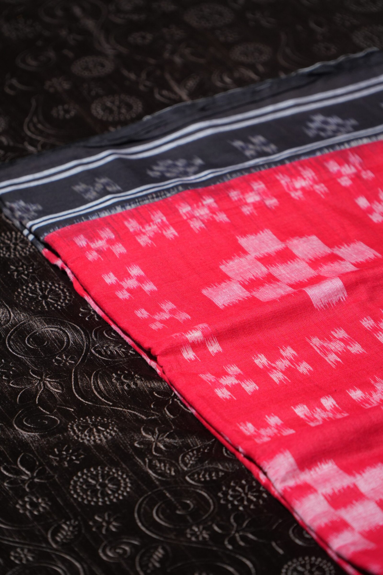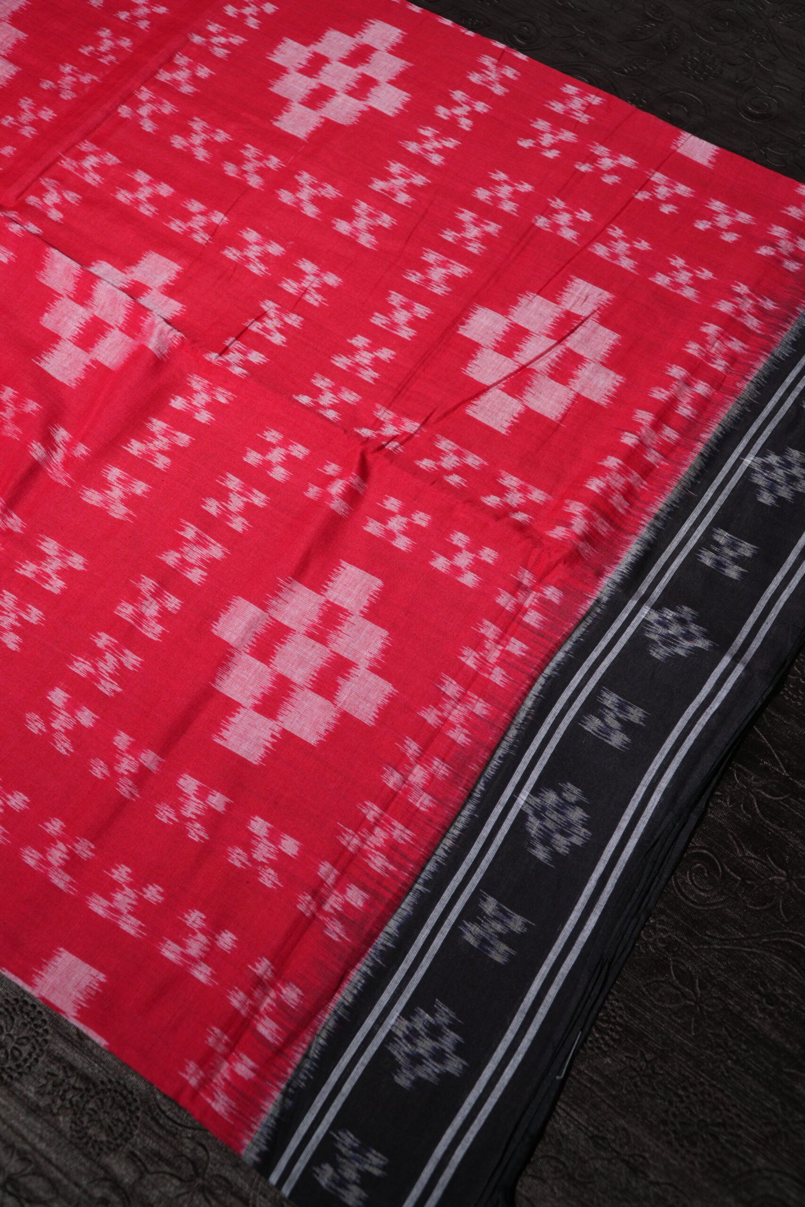 A timeless red and black handwoven Ikat saree with striking motifs and a bold traditional border.