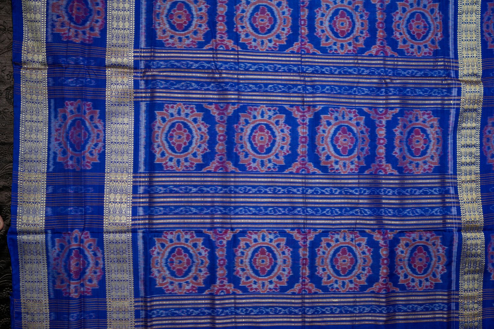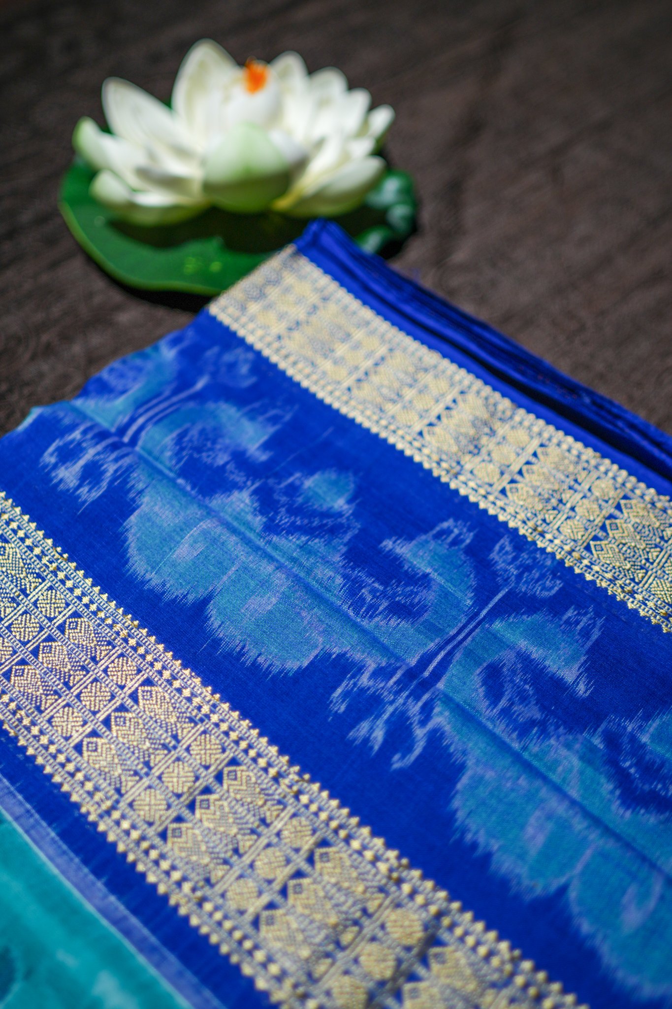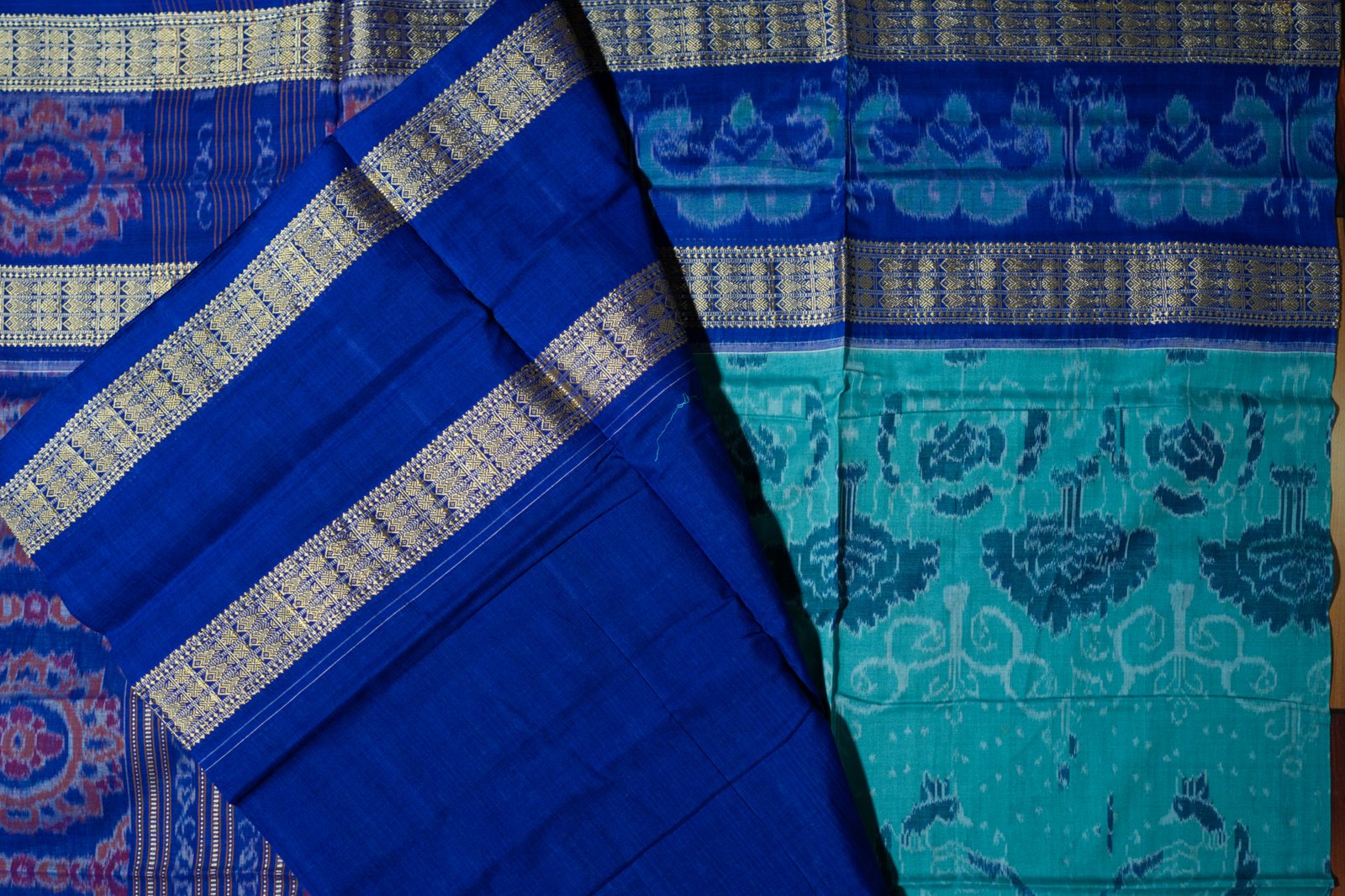 A stunning teal–blue Ikat saree enriched with intricate golden weaving.