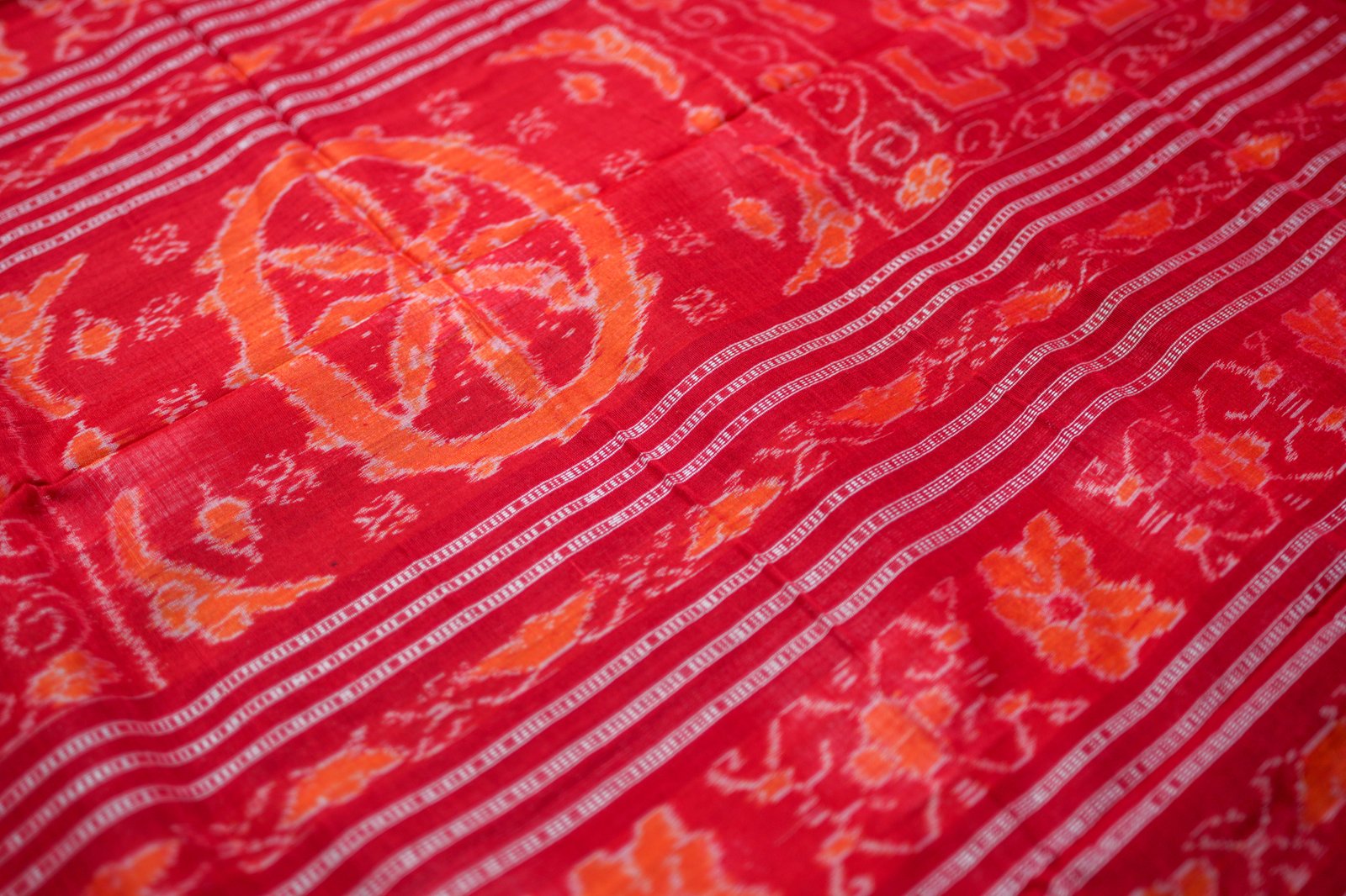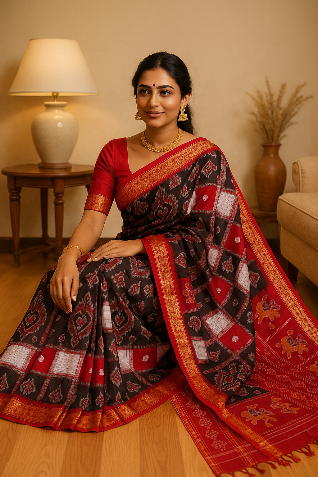 “Ruby Heritage Ikat” celebrates the beauty of traditional craftsmanship. The saree features deep ruby-maroon hues adorned with artistic Ikat motifs that reflect cultural richness. The golden zari border enhances its grandeur, making it an ideal choice for weddings, family functions, or festive gatherings. Its balanced design of patterns and textures adds depth and luxury, turning every drape into a statement of elegance.