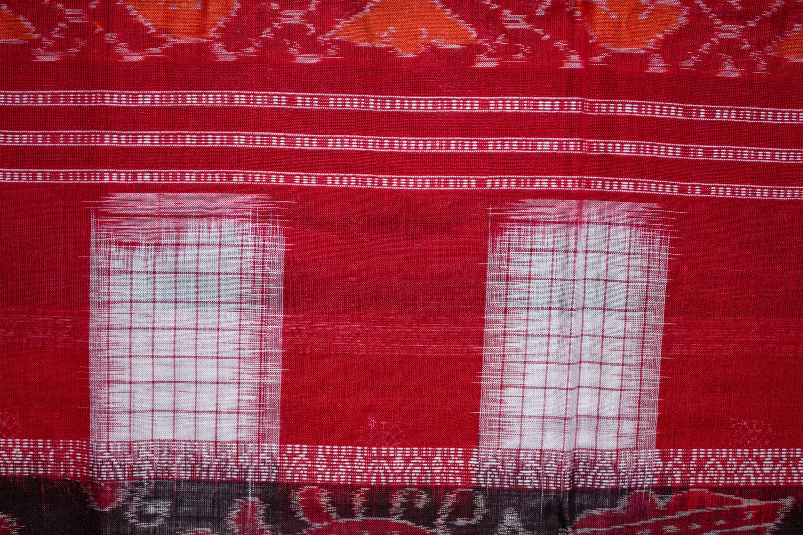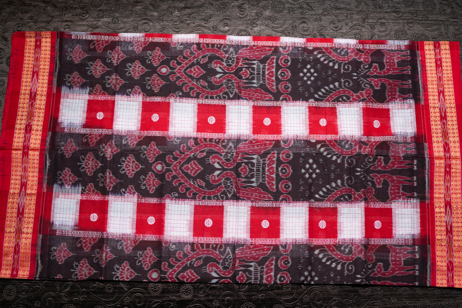 A heritage-inspired maroon Ikat saree with intricate threadwork and a traditional golden border.