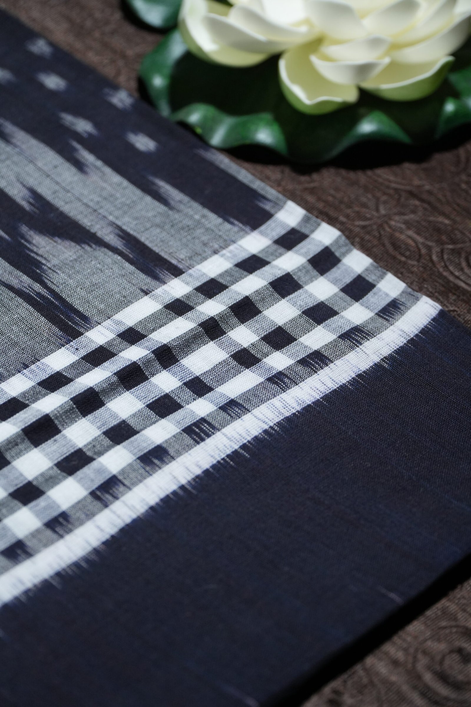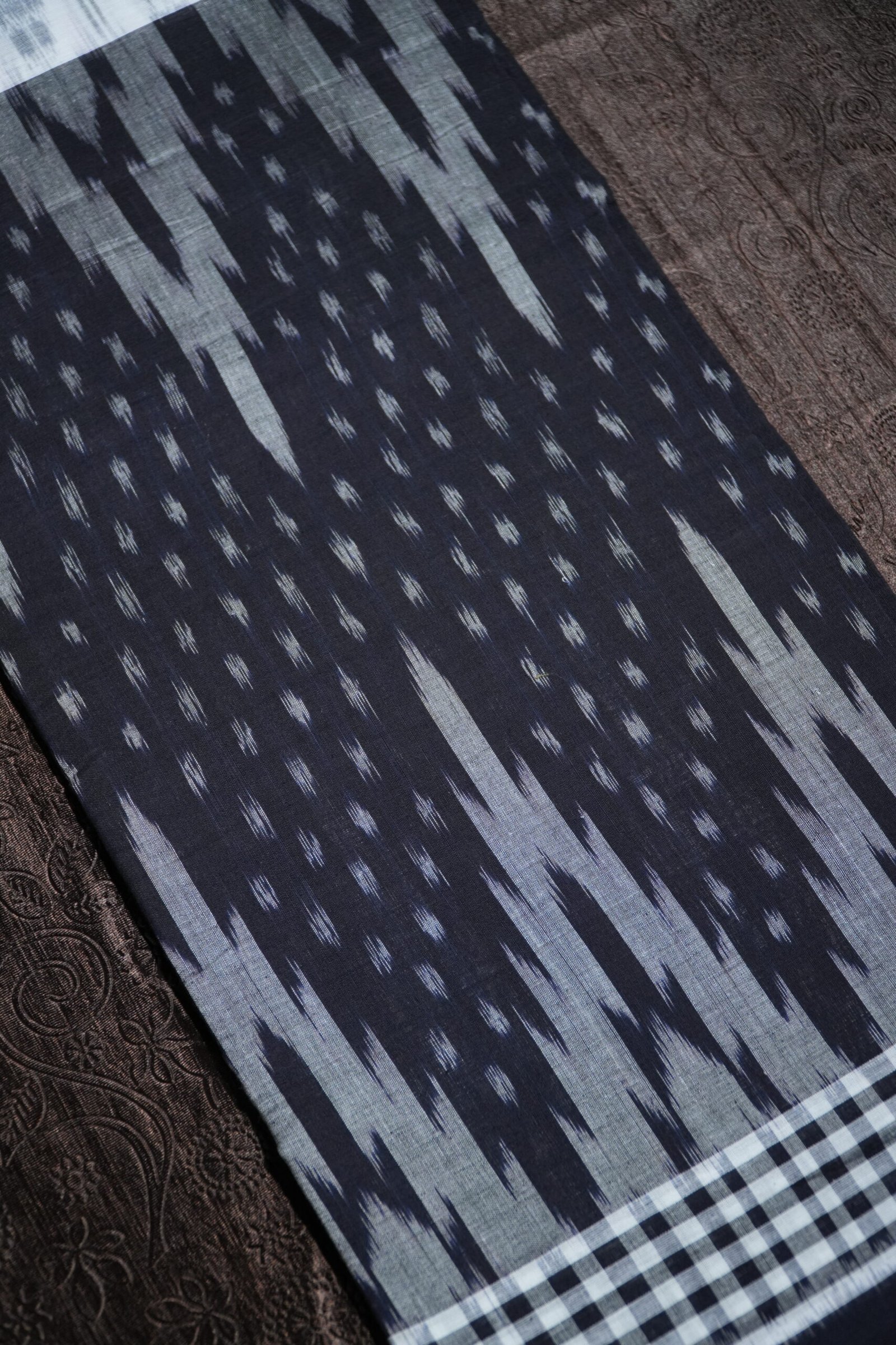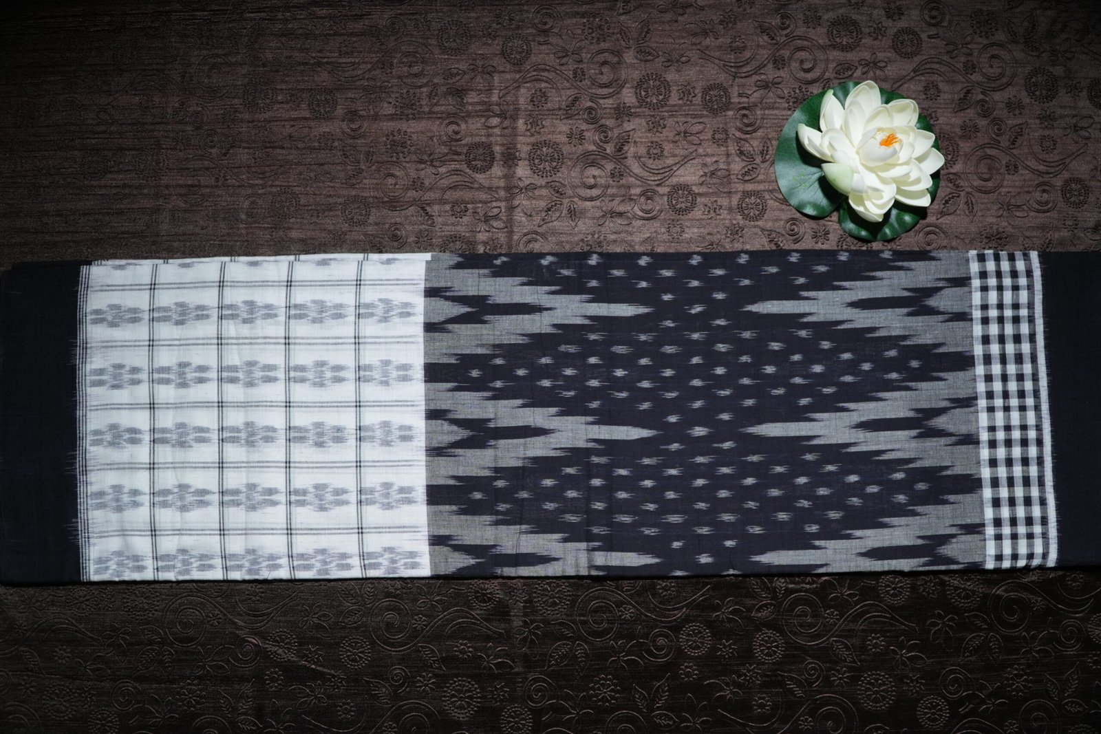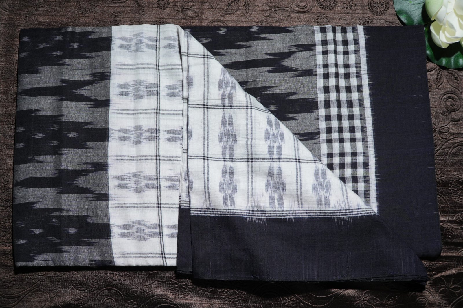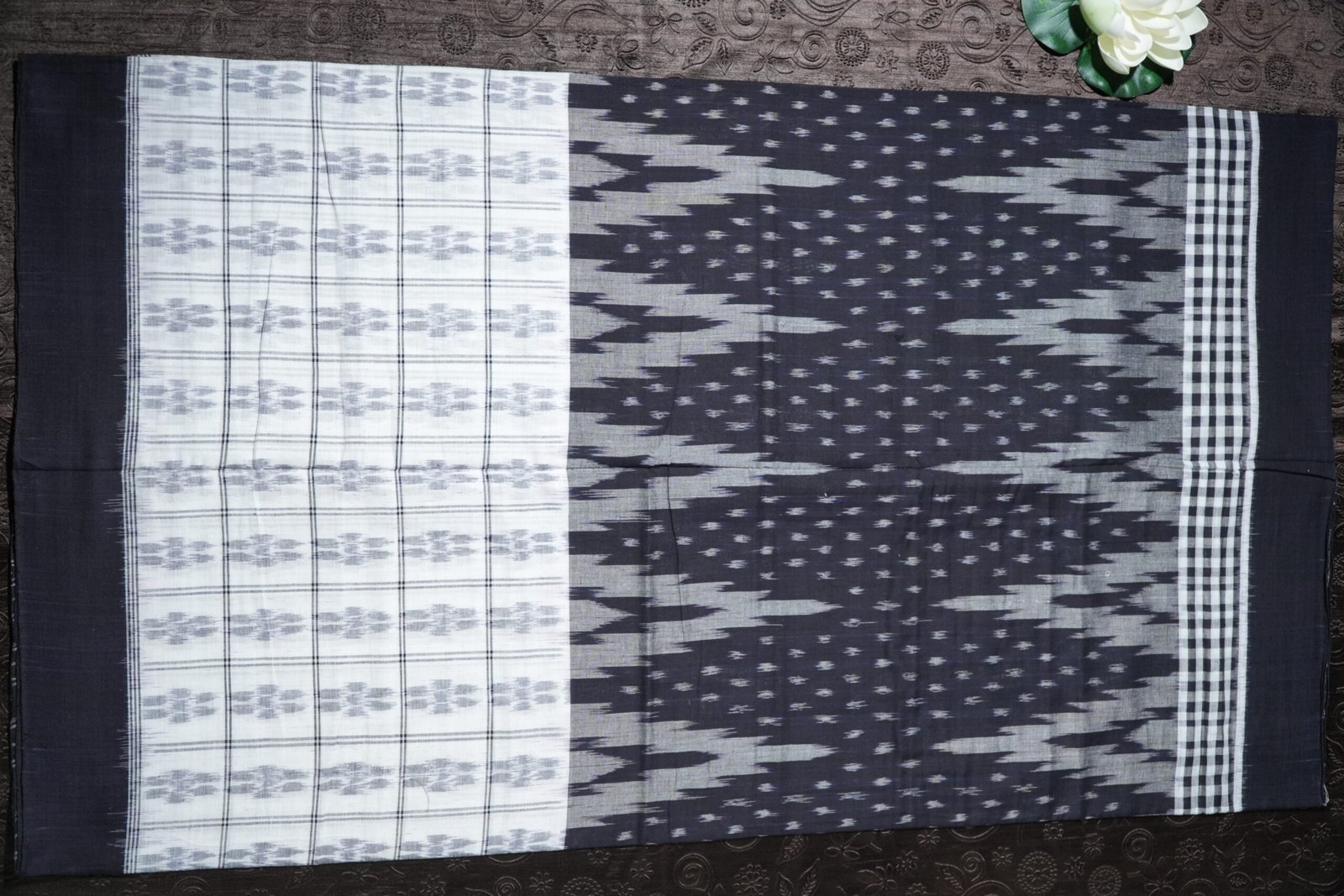 A graceful black and white ikat saree with traditional Sambalpuri patterns and a modern aesthetic.
