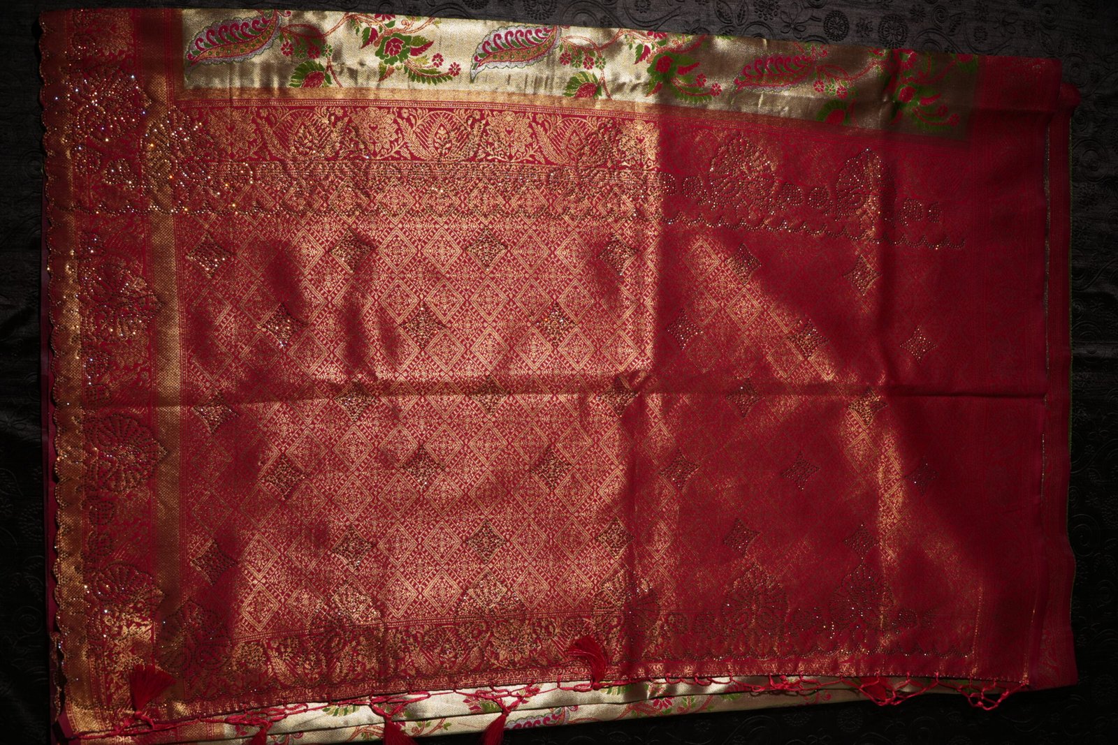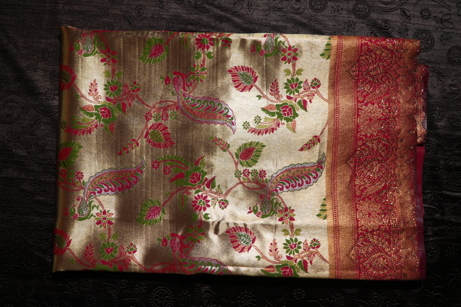A radiant golden saree adorned with delicate floral motifs and a rich red border.
