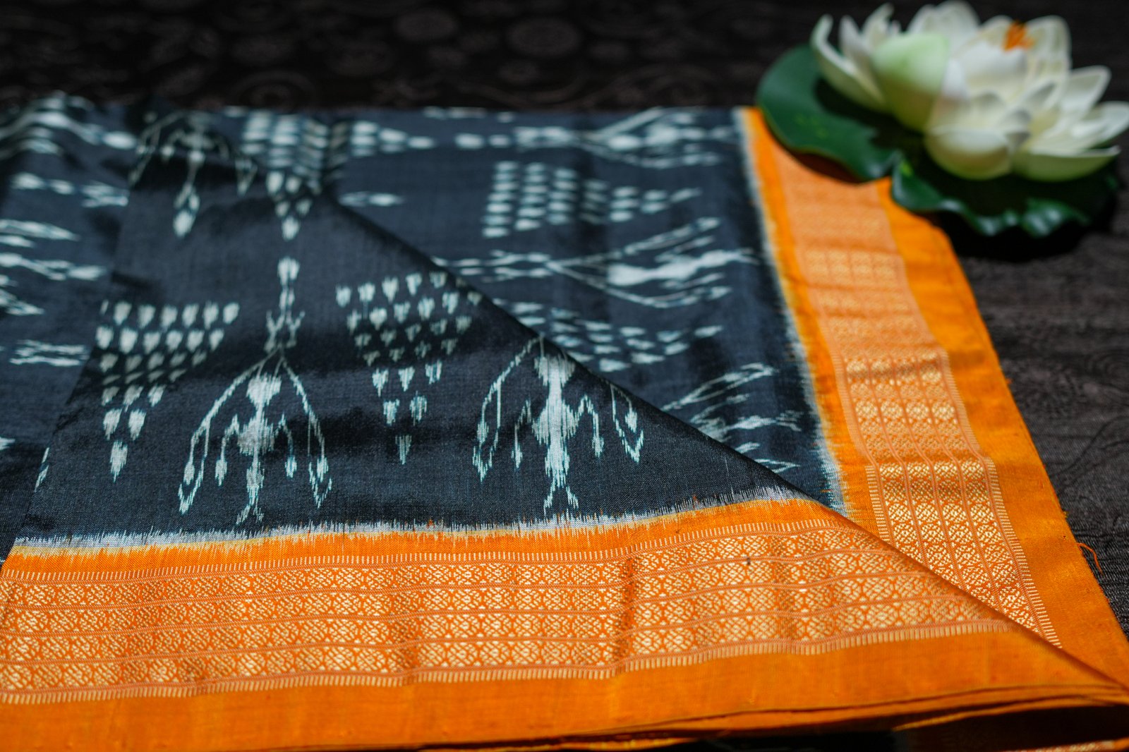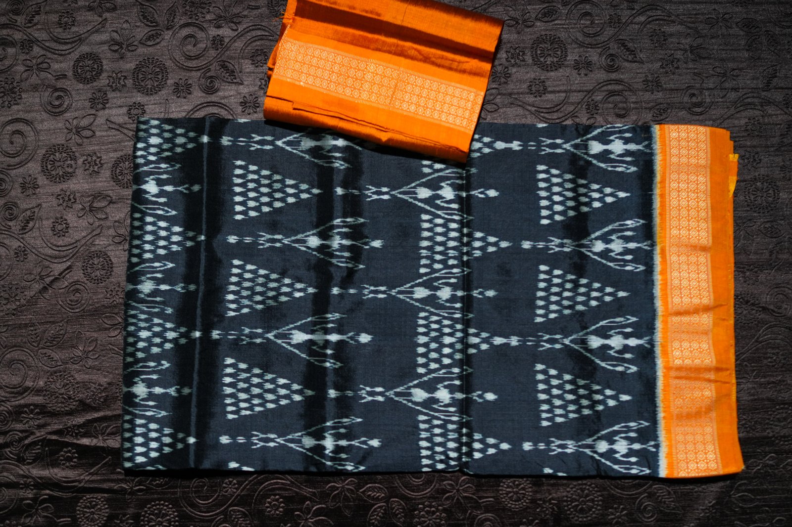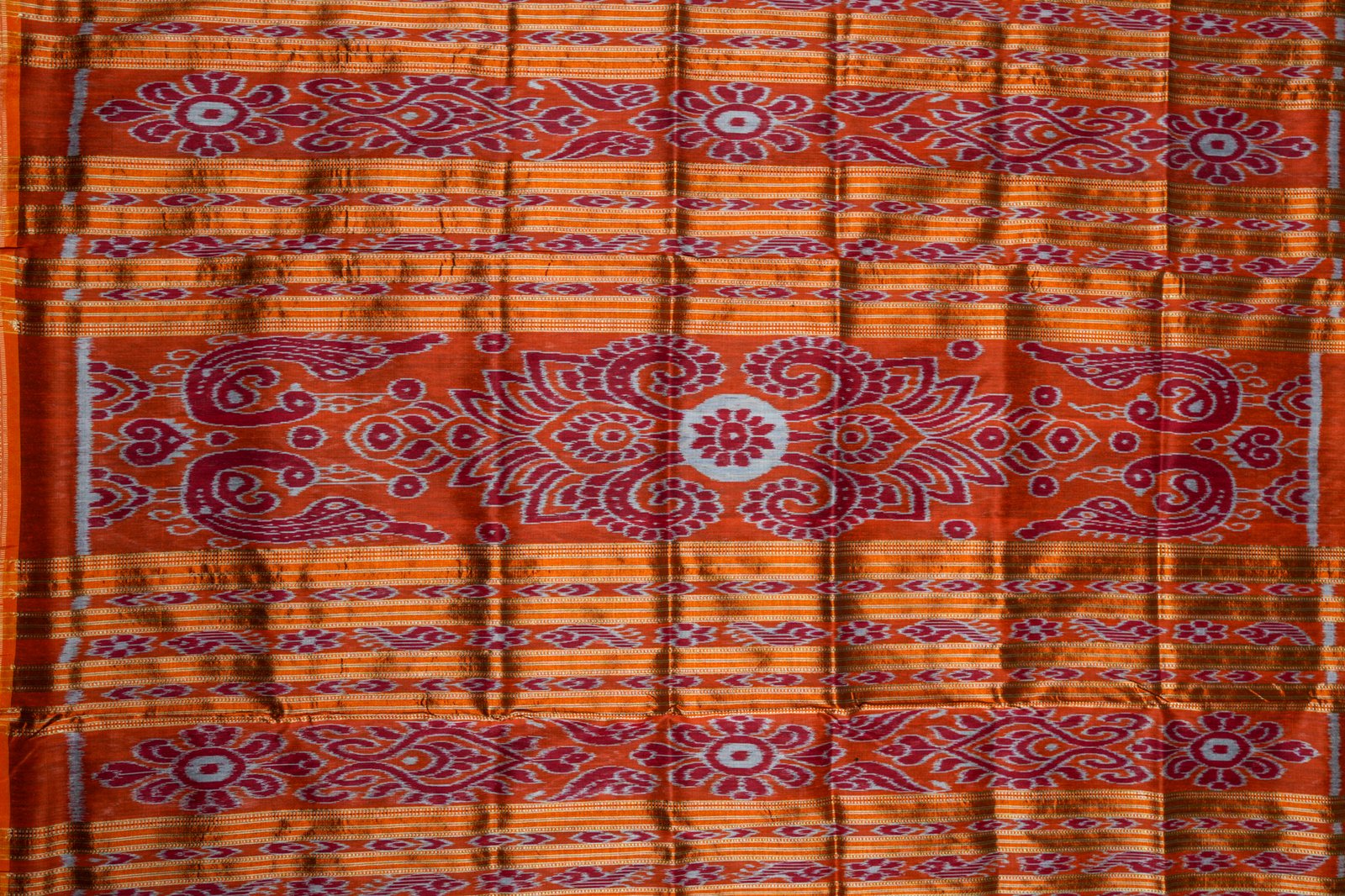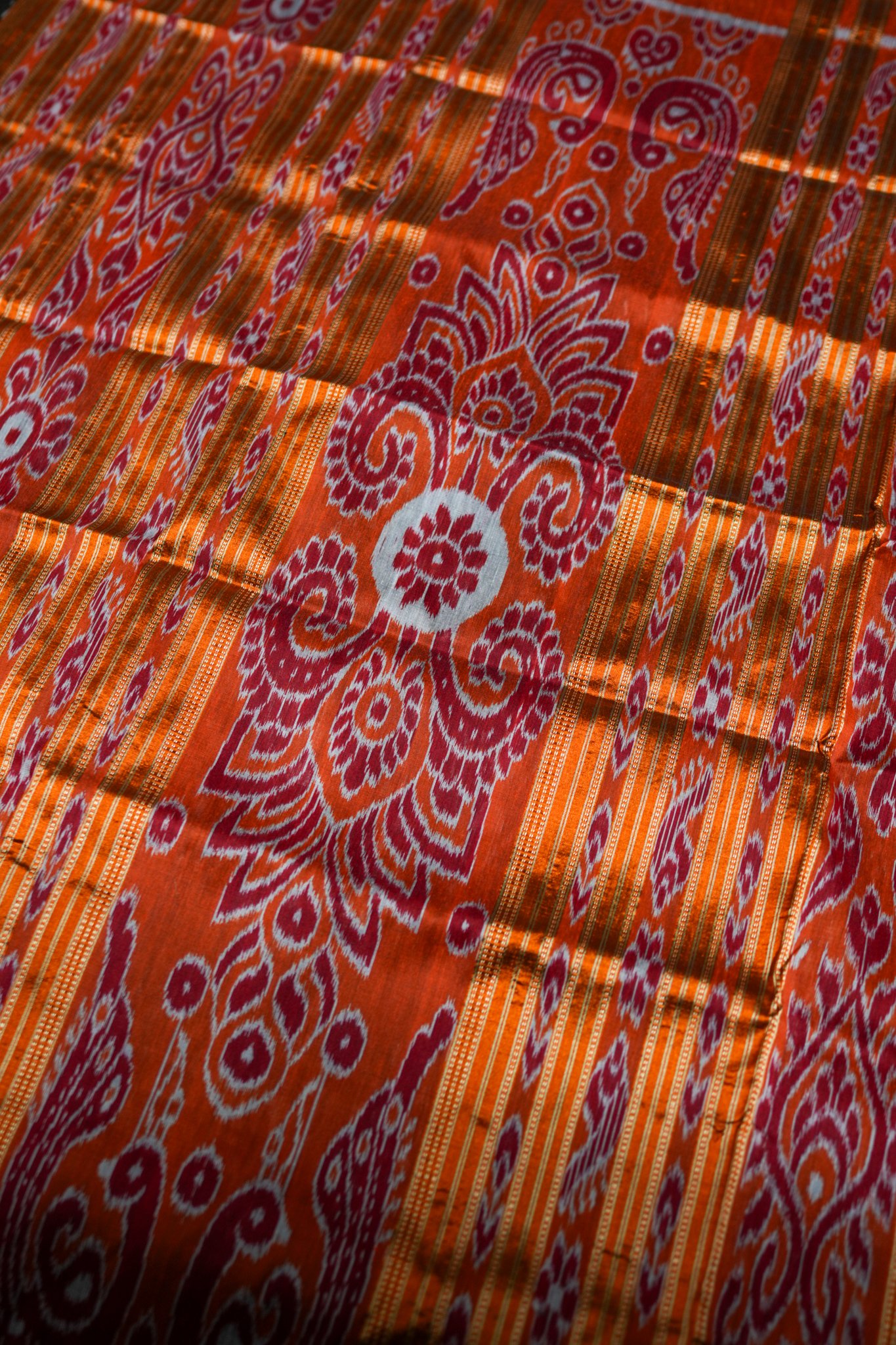 Traditional tie-and-dye weaving technique from Odisha, creating intricate motifs with perfect symmetry.