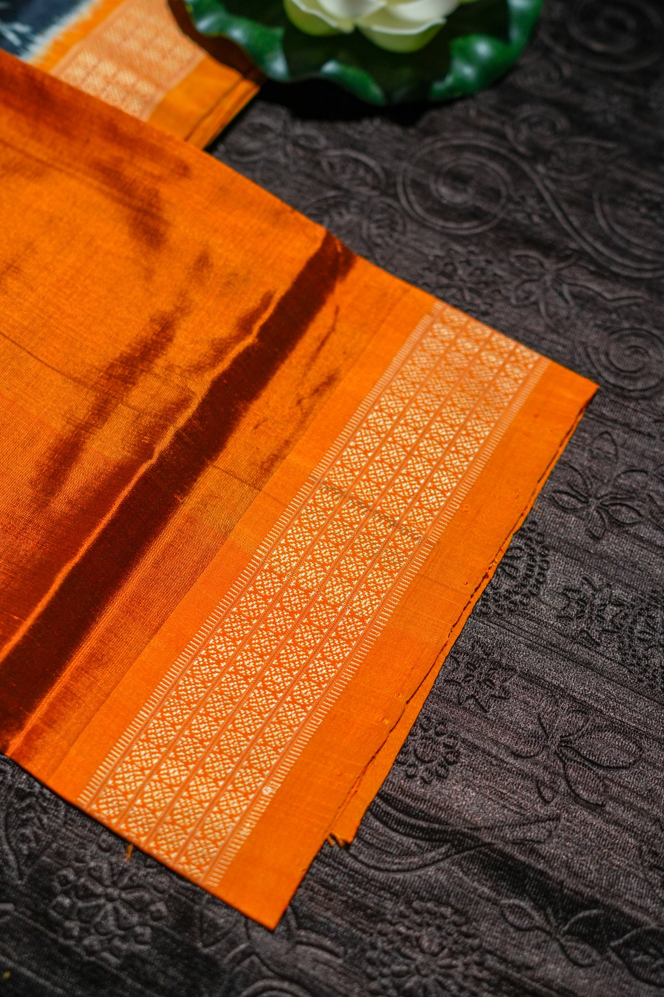 Richly woven border adds a golden glow, enhancing the overall festive and premium look.