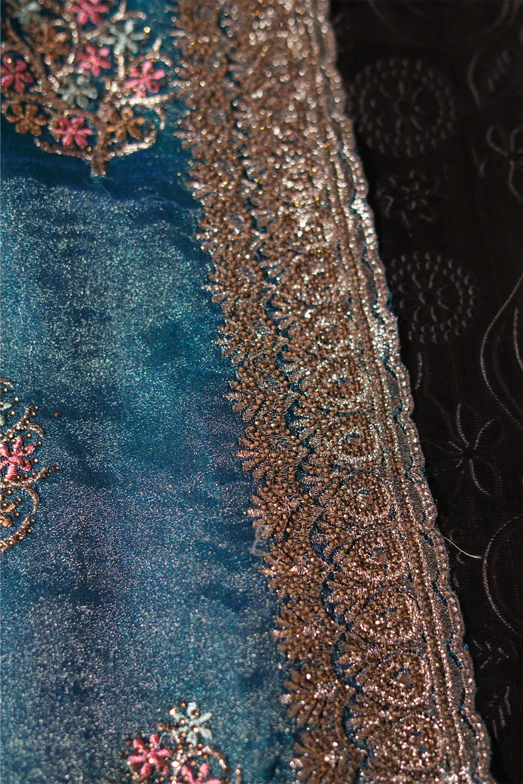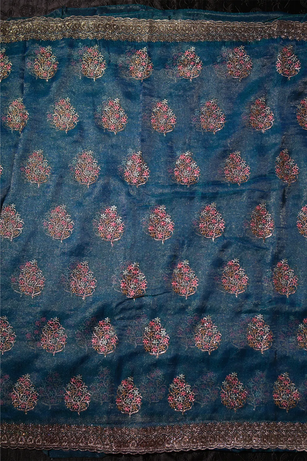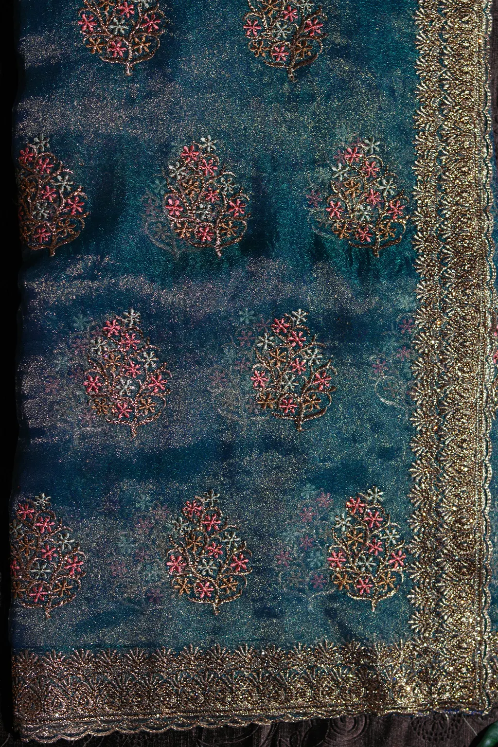 This elegant teal saree features a delicate floral pattern with gold accents, making it the perfect blend of tradition and grace for any festive or ceremonial occasion.