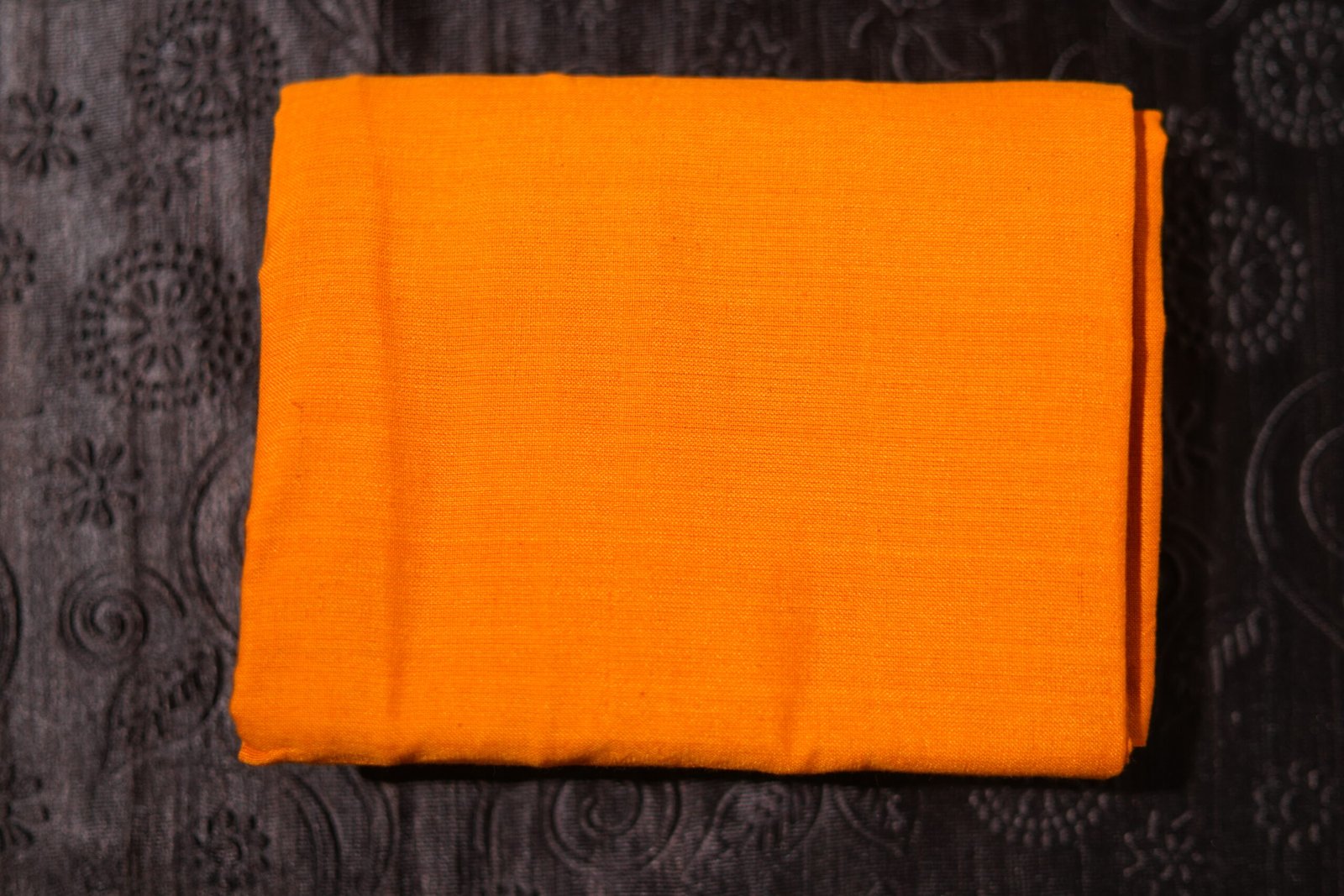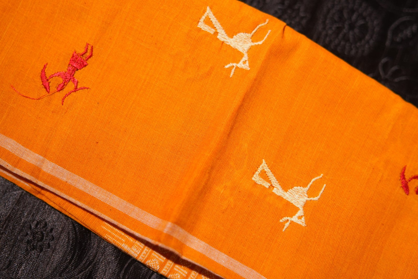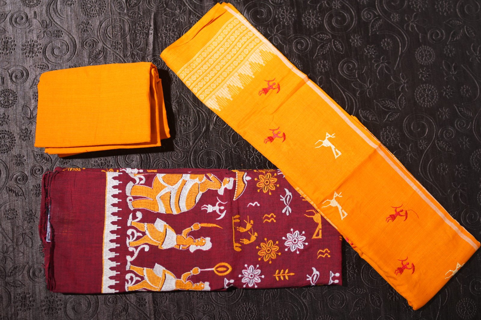 A vibrant Warli art dress material crafted in maroon and saffron hues, blending culture with contemporary elegance.